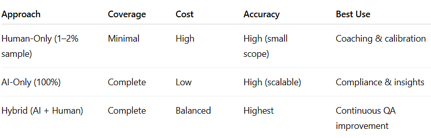 Human QA remains essential—but not for volume. It’s for judgment, nuance, and coaching.